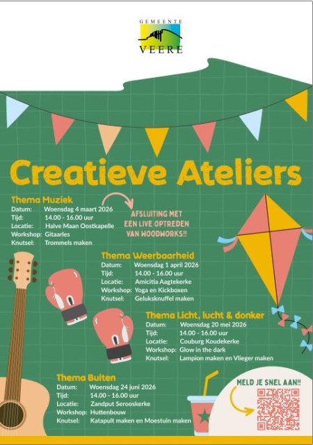 Na de eerste middag in Oostkapelle vinden er nog drie creatieve ateliers plaats in andere MFA’s (multifunctionele accommodaties) in de gemeente Veere. Elk atelier heeft een eigen thema, steeds met de keuze uit een workshop en een creatieve activiteit. Daarnaast worden de middagen begeleid door externe professionals, zodat alle kinderen een geslaagde en inspirerende middag beleven.