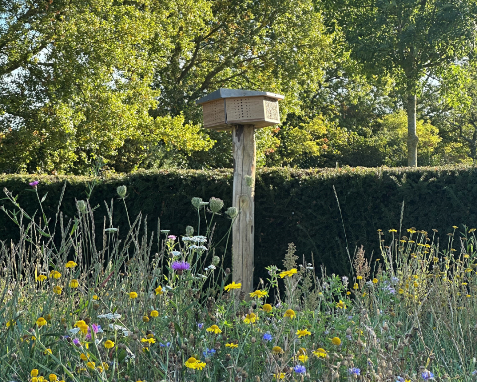 Maar bijen hebben naast voedsel ook nestplekken nodig. Daarom plaatsen we speciale bijenkasten. Deze zijn ontworpen door Wageningen Universiteit en getest in de praktijk. Ze bieden 500 nestplekken, met verschillende groottes en diameters, zodat veel soorten bijen er gebruik van kunnen maken.